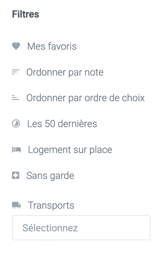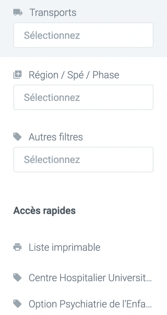 Pour trouver le stage qui vous intéresse, nous avons conçu un système de filtre multicritères très puissant : type de structure, agréments, spécialité, moyen de transport, formation disponible, etc. Il existe des centaines de critères pour que chaque interne y trouve son compte.