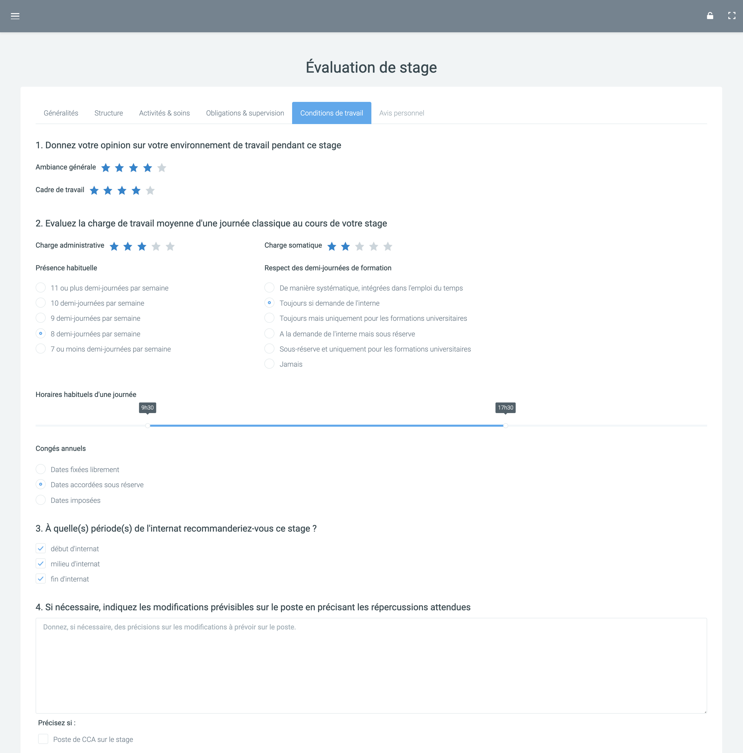 Un interne peut poster plusieurs évaluations sur une même période y compris pour des périodes antérieures. Il n’est pas limité inutilement. Tout est consigné dans les moindres détails et nous mettons automatiquement à jour la carte des stages pour que cela profite à tous.