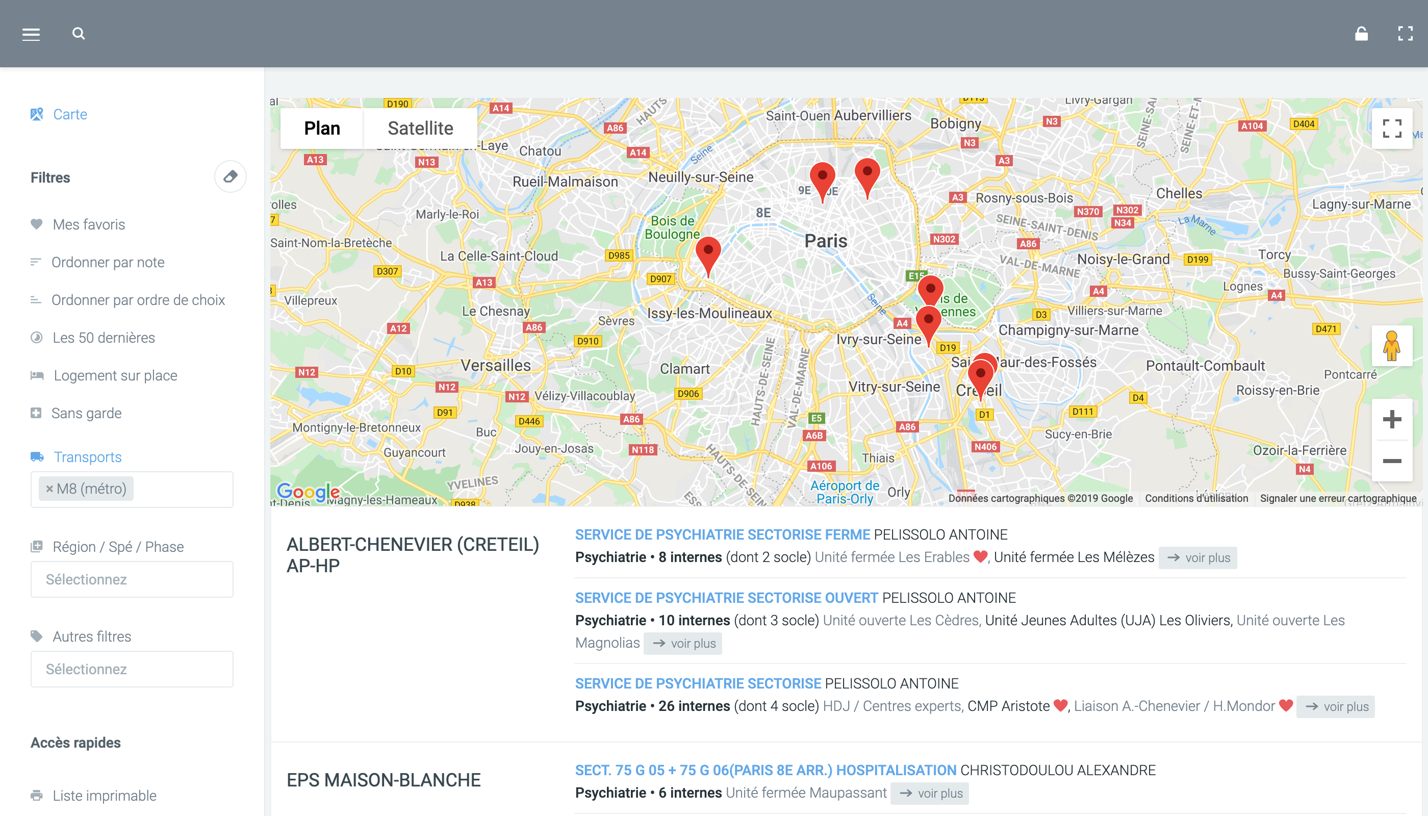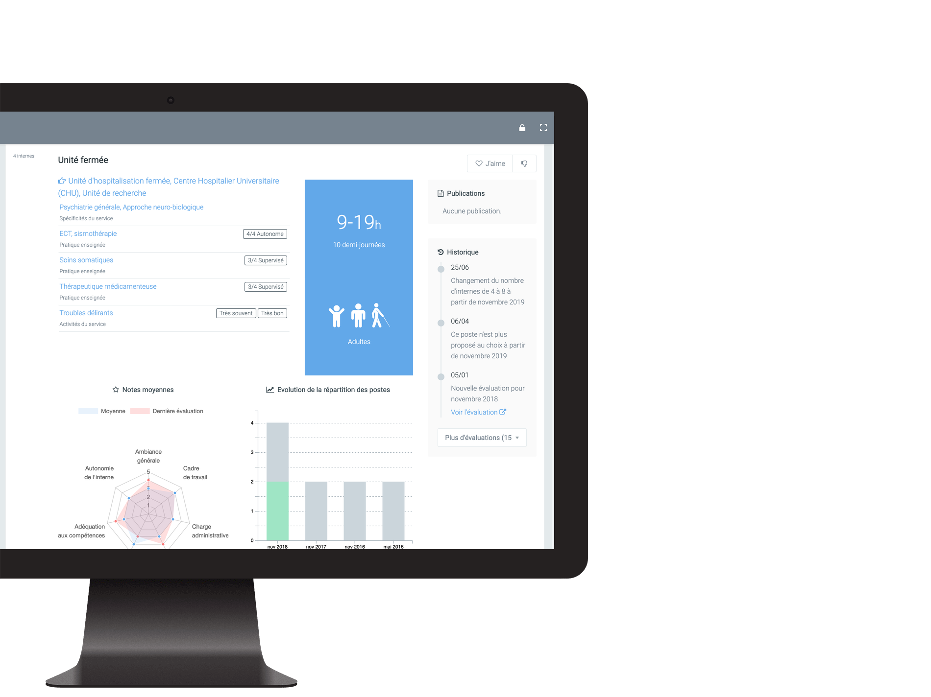 Et pour consulter les évaluations, nous avons créé une carte dynamique avec une navigation en poupée russe. Nous l’avons peaufinée pendant 2 ans. Partez de l’établissement, consultez les services puis les unités ; regardez le résumé des évaluations et si besoin chaque évaluation sur le stage, y compris des périodes précédentes ! C’est très intuitif et c’est ce que préfèrent nos utilisateurs.
