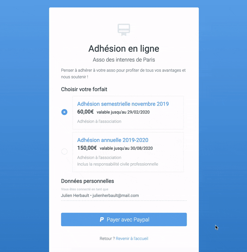 Activez le module d’adhésion en ligne via PayPal à votre association locale pour améliorer l’engagement de vos internes. Choisissez les forfaits à proposer, et laissez faire la plateforme : elle sollicite elle-même vos internes, au bon moment. Observez ensuite vos bons résultats dans votre administration.